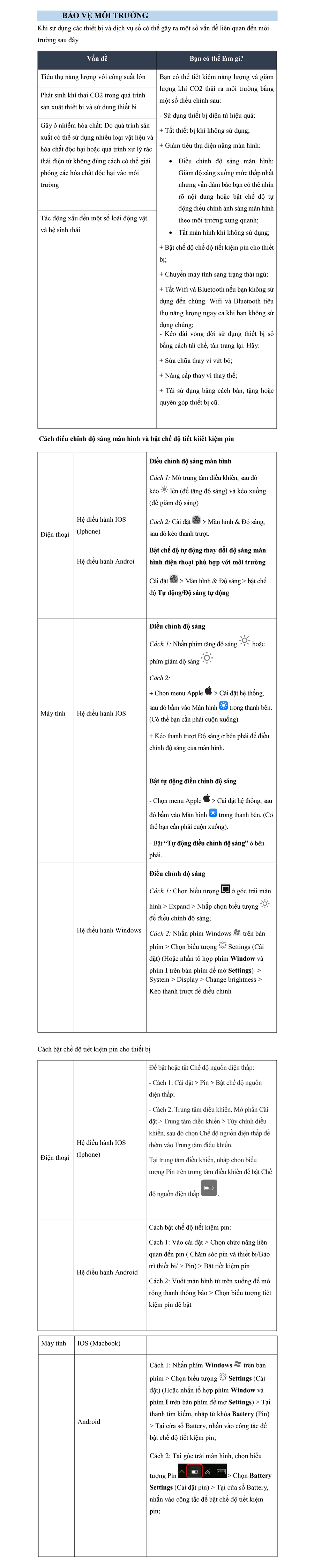 Nêu các vấn đề môi trường phát sinh từ việc sử dụng thiết bị và dịch vụ số: tiêu thụ năng lượng lớn, phát sinh khí thải CO2, ô nhiễm hóa chất, tác động xấu đến động vật/hệ sinh thái. Đưa ra các biện pháp người dùng có thể thực hiện: tiết kiệm năng lượng (tắt thiết bị, giảm sáng màn hình, bật tiết kiệm pin, tắt Wifi/Bluetooth, chuyển trạng thái ngủ), kéo dài vòng đời sử dụng thiết bị (sửa chữa, nâng cấp, tái sử dụng). Hướng dẫn cách điều chỉnh độ sáng màn hình và bật chế độ tiết kiệm pin trên điện thoại (iOS, Android) và máy tính (iOS, Windows).