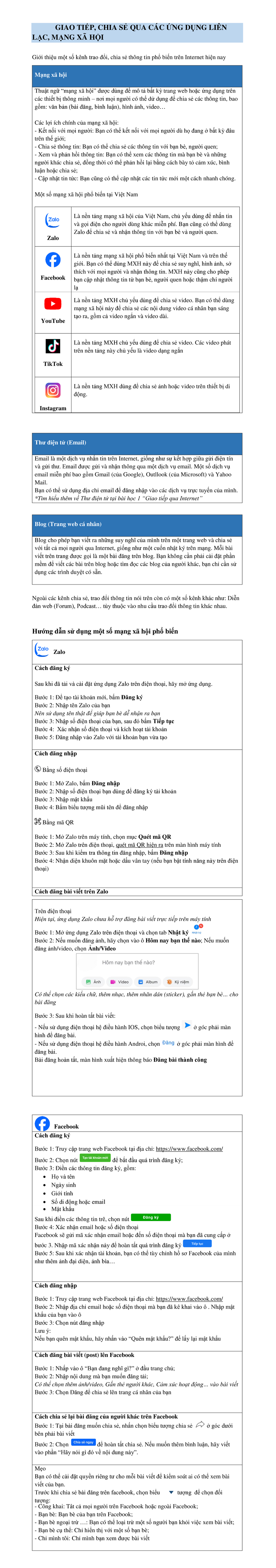 Giới thiệu mạng xã hội là nơi chia sẻ thông tin (văn bản, ảnh, video), lợi ích (kết nối, chia sẻ, xem/phản hồi, cập nhật tin tức). Nêu một số mạng xã hội phổ biến tại Việt Nam (Zalo, Facebook, YouTube, TikTok, Instagram). Giới thiệu Email, Blog. Hướng dẫn chi tiết cách đăng ký, đăng nhập, đăng bài và chia sẻ bài viết trên Zalo và Facebook, bao gồm cài đặt quyền riêng tư cho bài viết.