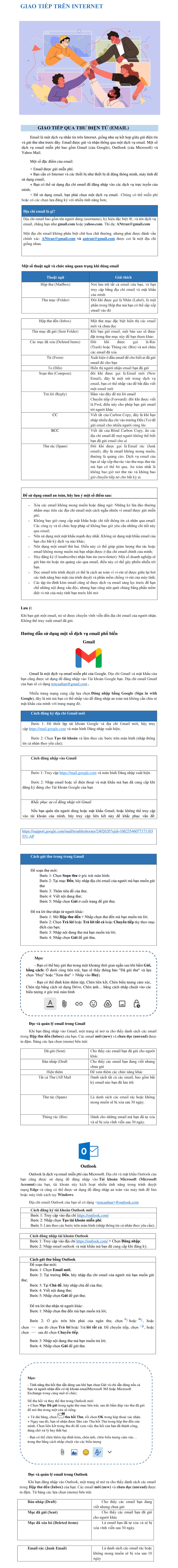 Giới thiệu Email là dịch vụ nhắn tin Internet miễn phí, cần thiết bị và Internet. Nêu cấu trúc địa chỉ email. Giải thích các thuật ngữ quan trọng (Hộp thư, Thư mục, Inbox, Sent, Deleted Items, From, To, Compose, Reply, Forward, CC, BCC, Spam). Hướng dẫn sử dụng email an toàn. Hướng dẫn đăng ký, đăng nhập, gửi, trả lời, đọc và quản lý email trên Gmail và Outlook.