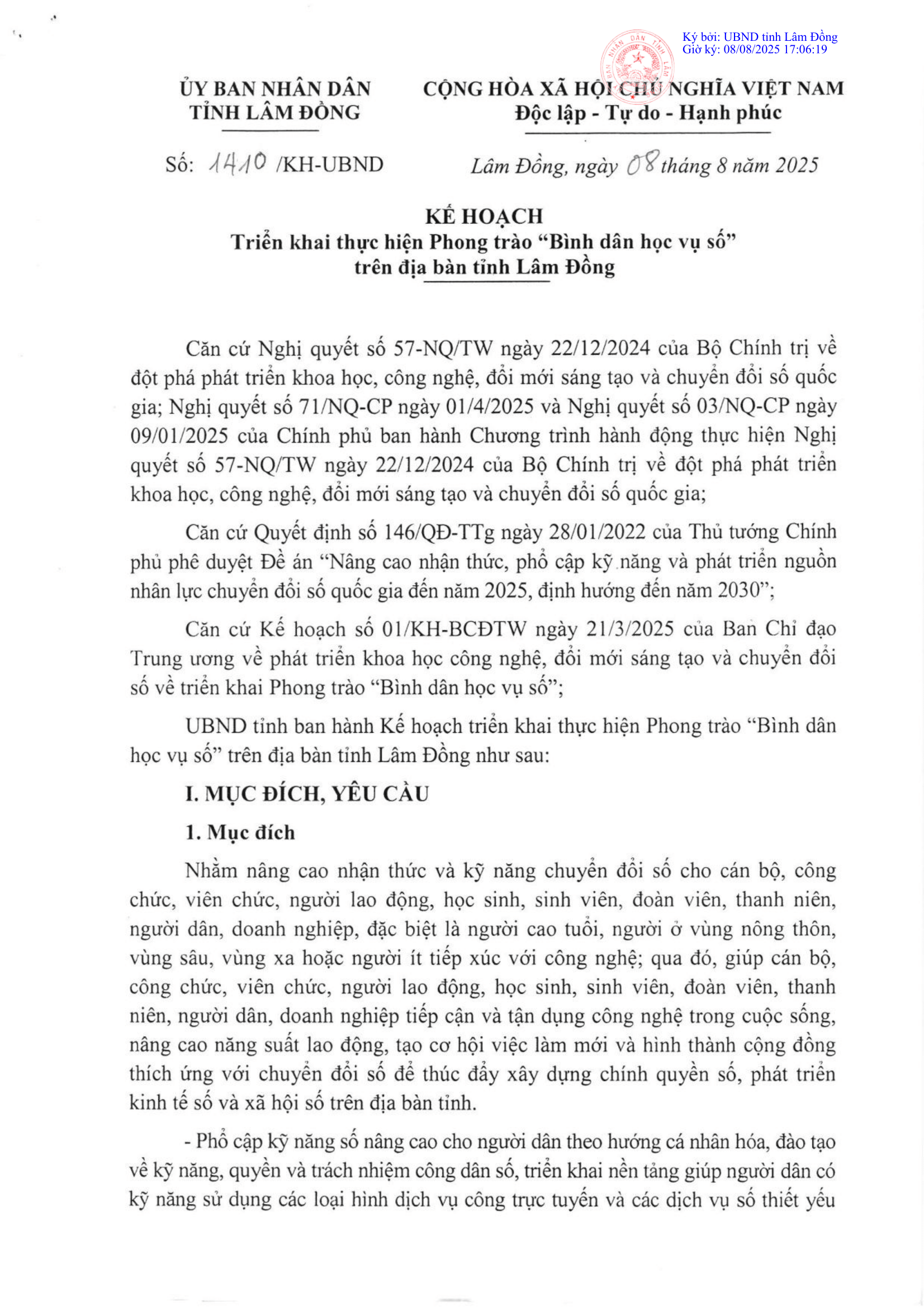 Kế hoạch triển khai thực hiện Phong trào "Bình dân học vụ số" trên địa bàn tỉnh Lâm Đồng