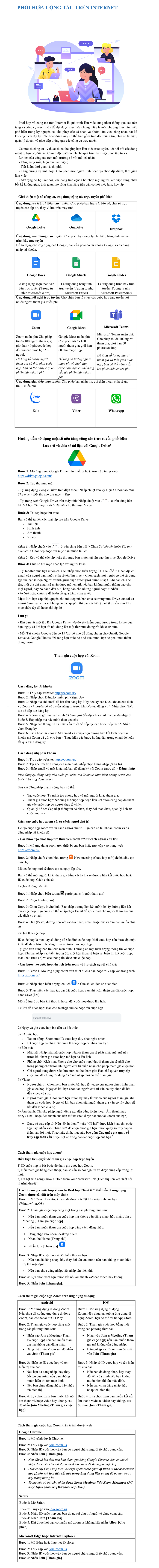 Giới thiệu định nghĩa phối hợp, cộng tác trên Internet là làm việc cùng nhau qua các nền tảng trực tuyến. Nêu lợi ích (tăng năng suất, tiết kiệm thời gian/chi phí, tăng linh hoạt, mở rộng cơ hội). Giới thiệu các công cụ số hỗ trợ: lưu trữ (Google Drive, OneDrive, Dropbox), văn phòng (Docs, Sheets, Slides), hội nghị (Zoom, Meet, Teams), giao tiếp (Zalo, Viber, WhatsApp). Hướng dẫn chi tiết sử dụng Google Drive (tạo/tải/chia sẻ) và Zoom (đăng ký/đăng nhập/tạo/tham gia cuộc họp).