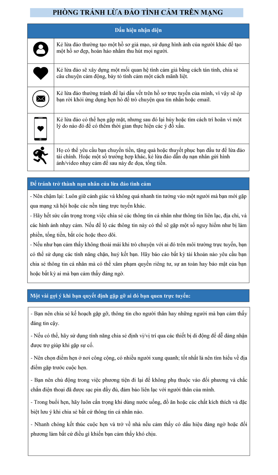 Mô tả các dấu hiệu nhận diện kẻ lừa đảo tình cảm online: tạo hồ sơ giả, xây dựng mối quan hệ giả (tán tỉnh mãnh liệt), tránh để lại dấu vết online, ép chuyển kênh trò chuyện, trì hoãn gặp mặt, yêu cầu chuyển tiền/quà hoặc gửi ảnh/video nhạy cảm. Nêu cách phòng tránh: chậm lại (không tin tưởng nhanh), cẩn trọng chia sẻ thông tin cá nhân/nhạy cảm, chặn/hủy kết bạn/báo cáo tài khoản đáng ngờ. Đưa ra gợi ý an toàn khi quyết định gặp mặt trực tiếp (chia sẻ kế hoạch/vị trí, chọn nơi công cộng, chủ động đi lại, cẩn trọng đồ ăn/thức uống, kết thúc nếu thấy khó chịu).