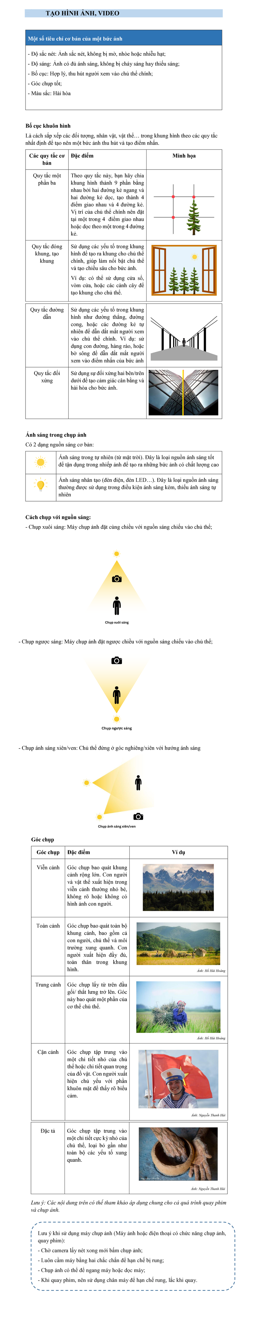 Nêu các tiêu chí cơ bản của một bức ảnh/video tốt (sắc nét, sáng, bố cục, góc chụp, màu sắc). Giải thích các quy tắc bố cục khuôn hình (một phần ba, đóng khung, đường dẫn, đối xứng). Nêu các dạng nguồn sáng (tự nhiên, nhân tạo) và cách chụp (xuôi/ngược/xiên sáng). Giải thích các góc chụp phổ biến (viễn cảnh, toàn cảnh, trung cảnh, cận cảnh, đặc tả). Nêu lưu ý khi chụp ảnh/quay phim bằng máy ảnh hoặc điện thoại.